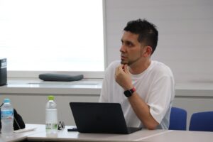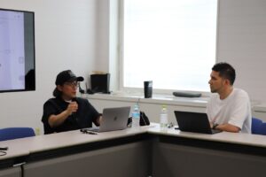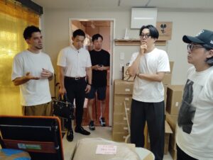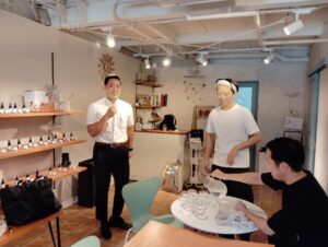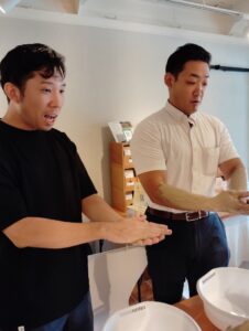 後継者の前原潤社長(左)に、レクチャーを受けます。