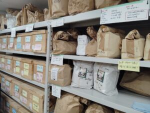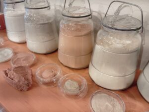 ハーブとクレイのストック。原料となるクレイは、採掘後にフランスで