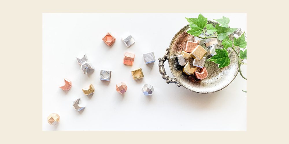 「つみきん」は金属でできた「小さなつみき」。ネコ好きの人が日常に「ちょっとした遊び心」と「ねこ」を感じられる商品です。銅、アルミ、真鍮の金属を切り出し、金属の表面には職人が1つ1つ水面の波を表現するオリジナルツールマーク「はもん」と「さざなみ」を施し、光の反射が美しく映えるよう輝きを持たせました。